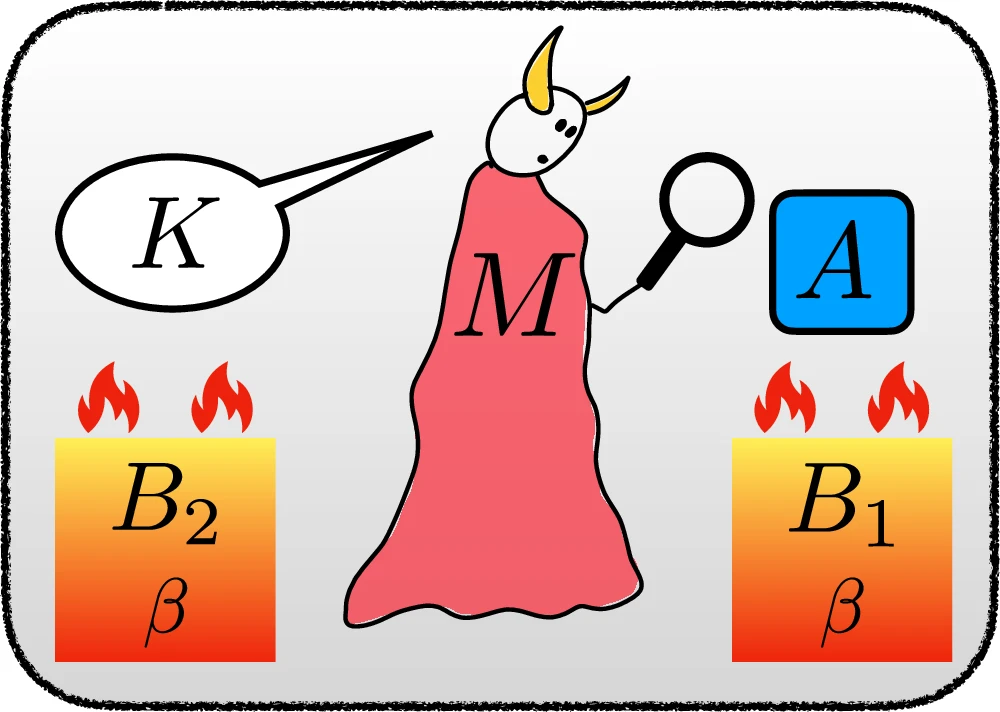 - 悪魔の内部状態M (Demon's Internal State M): 悪魔が情報を集めるための「脳」や「記憶装置」にあたります。虫眼鏡を持っている姿で描かれ、系Aを観察している様子を表しています。