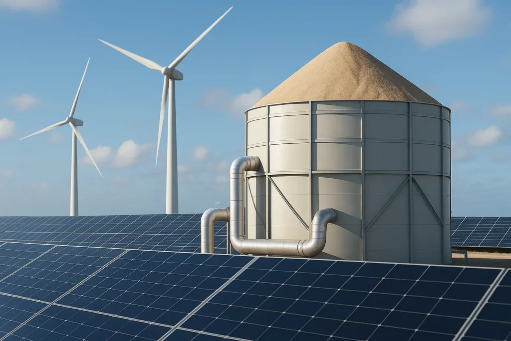砂電池は、太陽光発電や風力発電で生まれた余った電気を使い、砂を約500℃まで加熱します。この高温の砂は、断熱材で包まれたサイロやコンテナの中で長期間熱を保持できます。電気を直接ためるのではなく、砂に「熱」としてエネルギーを保存するのが特徴です。必要なときには、サイロ内の砂に空気を通して熱を取り出し、町の暖房やお湯の供給に利用します。