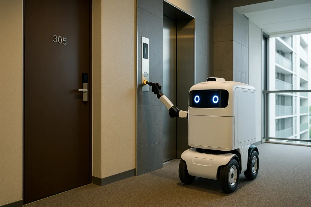 ロボットはアームでオートロックを解錠し、エレベーターを操作して目的のフロアへ移動し、住戸の玄関先まで荷物を運びます。希望すれば置き配や対面受け取りも可能です。