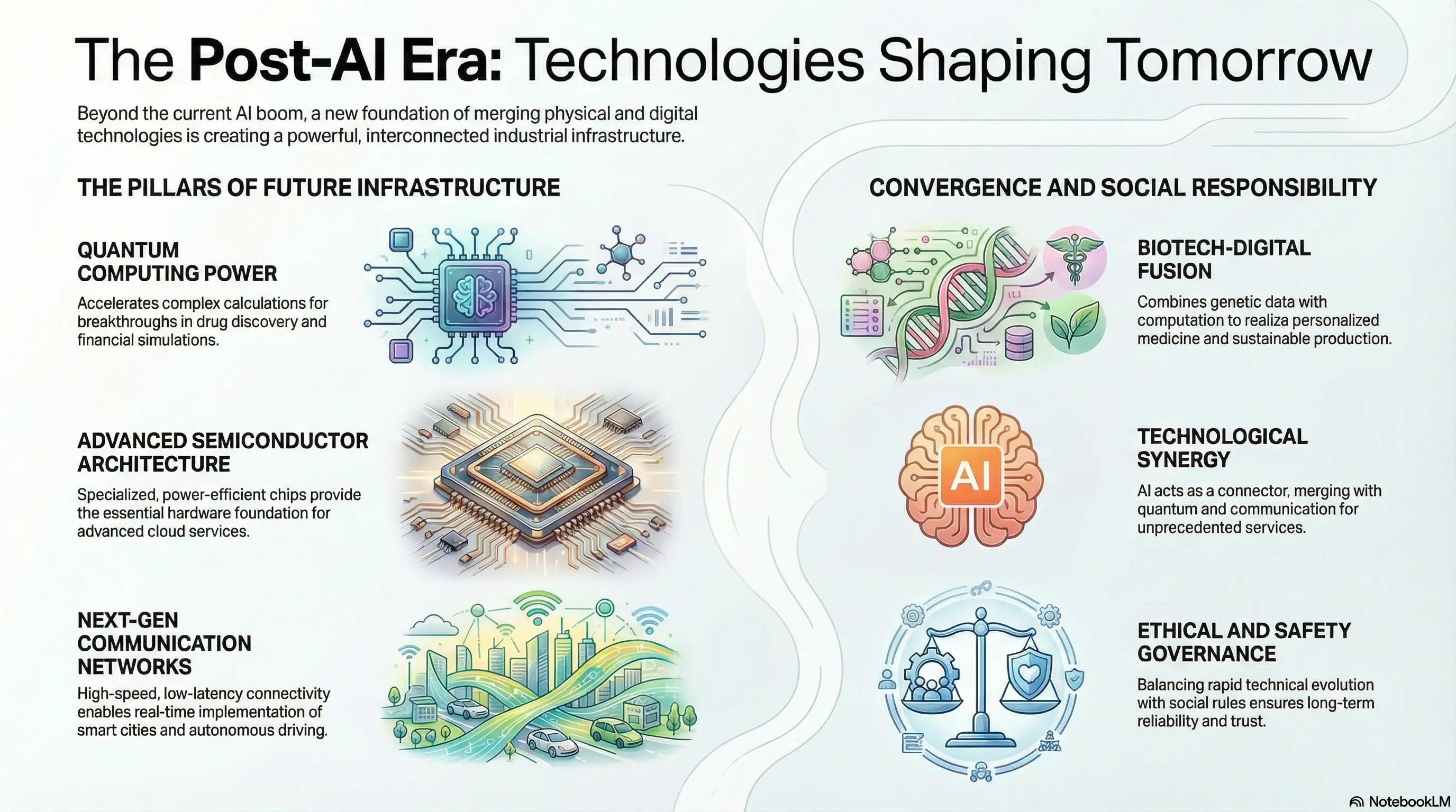 重要なのは、これらの技術が単独で社会を変えるのではなく、相互に結びつきながら影響を広げていく点です。AIはすでにさまざまな分野に入り込み、その上に量子技術、次世代通信、先進半導体が重なります。