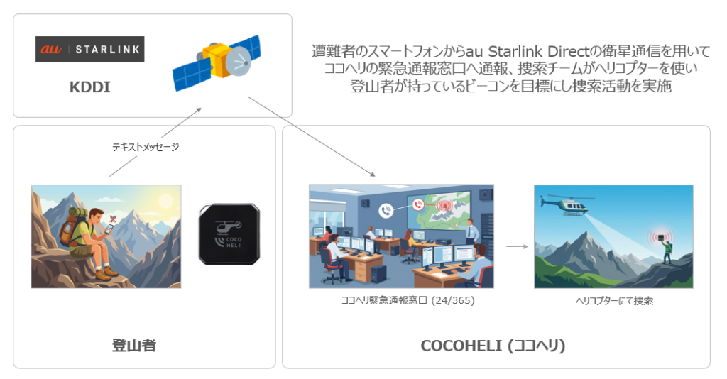 AUTHENTIC JAPANとKDDIは、会員制山岳捜索サービス「ココヘリ」で、通信圏外でもSMSで救助要請ができる「ココヘリSOSダイレクト」を2026年4月に始める予定です。あわせて位置共有アプリ「HITOCOCO」もau Starlink Directに対応します。